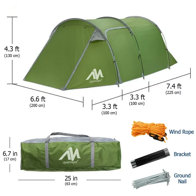 Features [2 DOOR VESTIBULE] - The bike tent offers 2 doors in the vestibule to provide excellent ventilation, there are two vents in the front door corner, so you won't feel stuffy even without the door open. And the vestibule in front is a wonderful storage space, you can store your shoes or some other things under it to the left and right side of the door and have enough room for a dog to join you. [Waterproof] - The waterproof tent consists of 2 functional layers, the liner is made of B3 mesh and 190T breathable Polyester, the outer tent is made of 210T Rip-stop Polyester, it has passed the waterproof test with a rating above 3000mm, offers high performance in extreme weather conditions. [ROOMY ENOUGH FOR 4-5 PERSONS] - The size of the entire camping tent is 14ft x 6.6ft x 4.3ft, the sleeping area is 7.4ft x 6.6ft x 4.3ft, it can accommodate up to 4-5 people, the vestibule is 6.6ft x 6.6ft x 4.3ft, the spacious space enlarges your activity area and storage area. [UPGRADE FIBERGLASS] - 3 shock-absorbing poles can support most heavy wind rain and snow. Stay secure. [D-STYLE MESH DOOR] - Inner tent has a large 2-way zipper D-style door with full mosquito mesh protection and improved ventilation. Front and D-shaped side doors allow you to enter or return without crossing over your partner. [EASY SETUP] - The setup of this tunnel tent is easy and fast, insert the 3 shock-absorbing poles into each sleeve, then fix them with tent stakes, the outer tent is set up, then hang on the inner tent, the setup is finished, it could be done within 5minutes by just one person.
