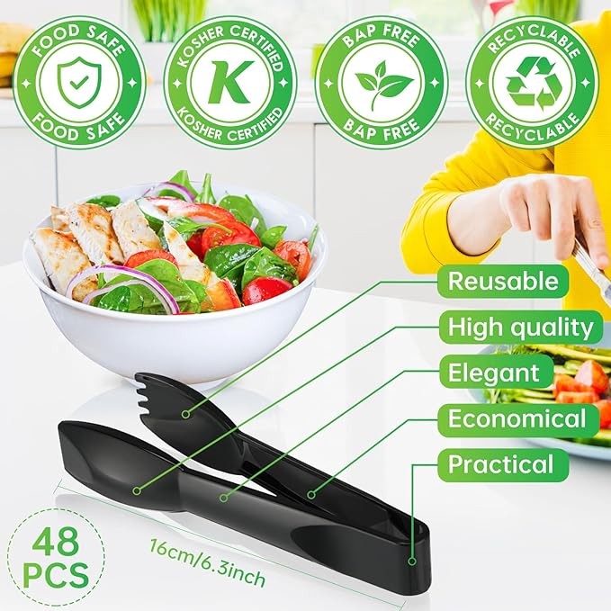 • 48 Pieces of 6 Inch Plastic Tongs: each serving tong is 6 inches long, easy to grip, and comfortable to use; Convenient design is nice for all your dinner party, catering or buffet needs; They can be hand washed and reused, or discarded after one use