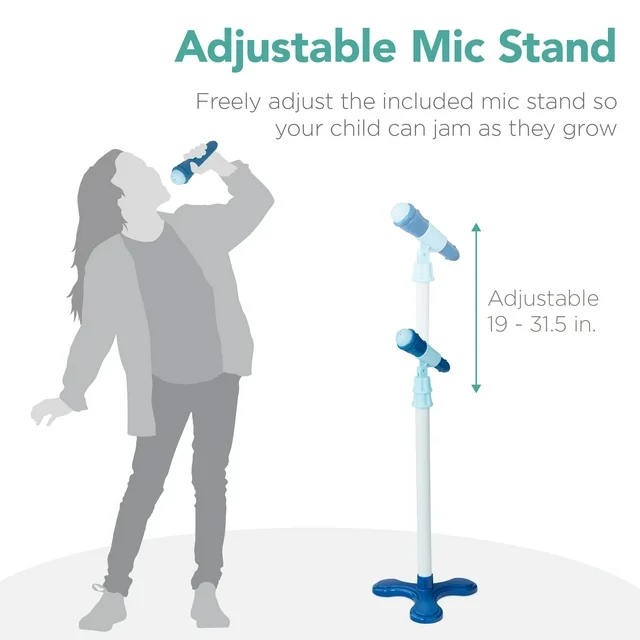 ADJUSTABLE MIC STAND: Raise and lower the microphone stand to fit children of all sizes and help them perform as they grow up; OVERALL DIMENSIONS: 19"(L) x 7.5"(W) x 1.75"(H)