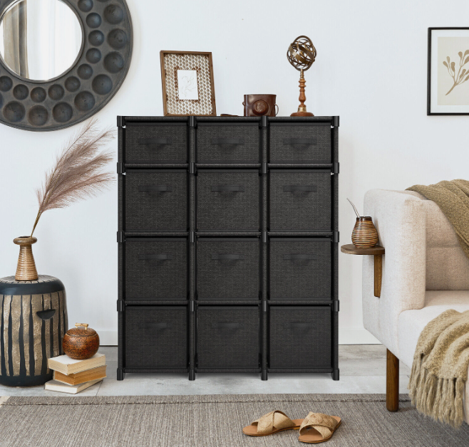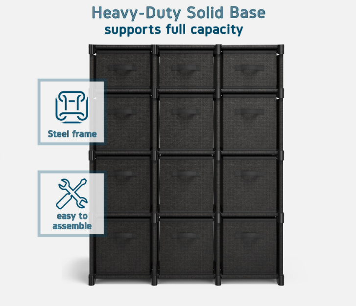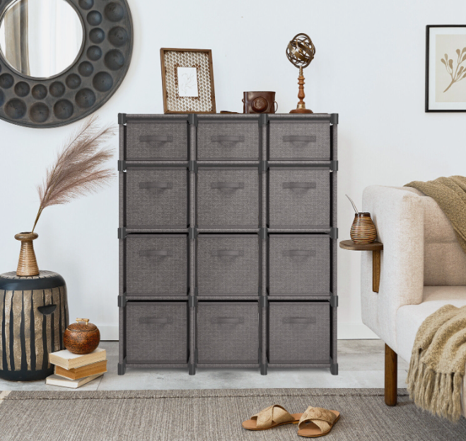 • 12 Cube Size Includes: 9 large bins measuring 10.4” L x 10.4” W x 11” H and 3 small bins measuring 10.4” L x 10.4” W x 5.3” H. Total dimensions 36.1” L x 11.9” D x 42.7” H.