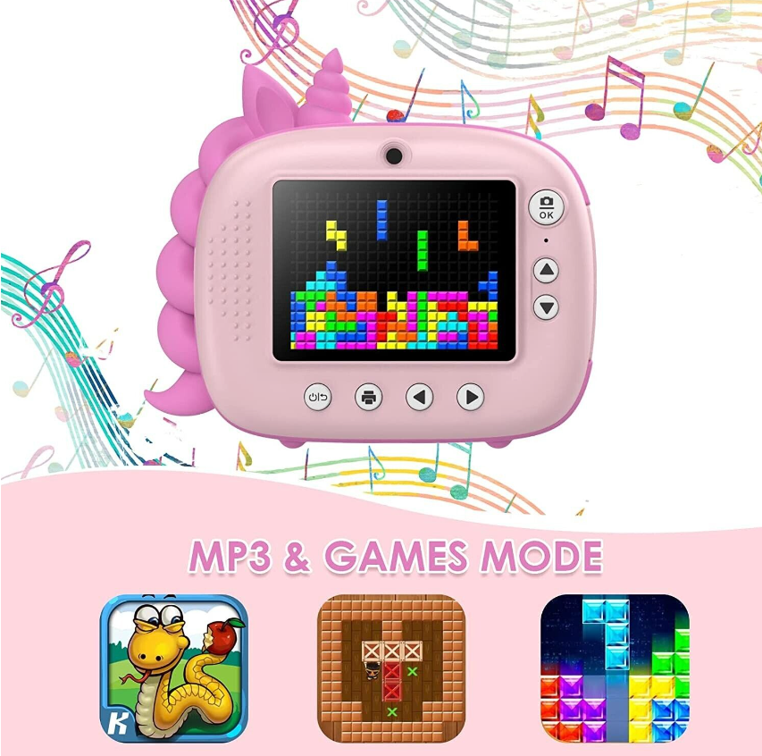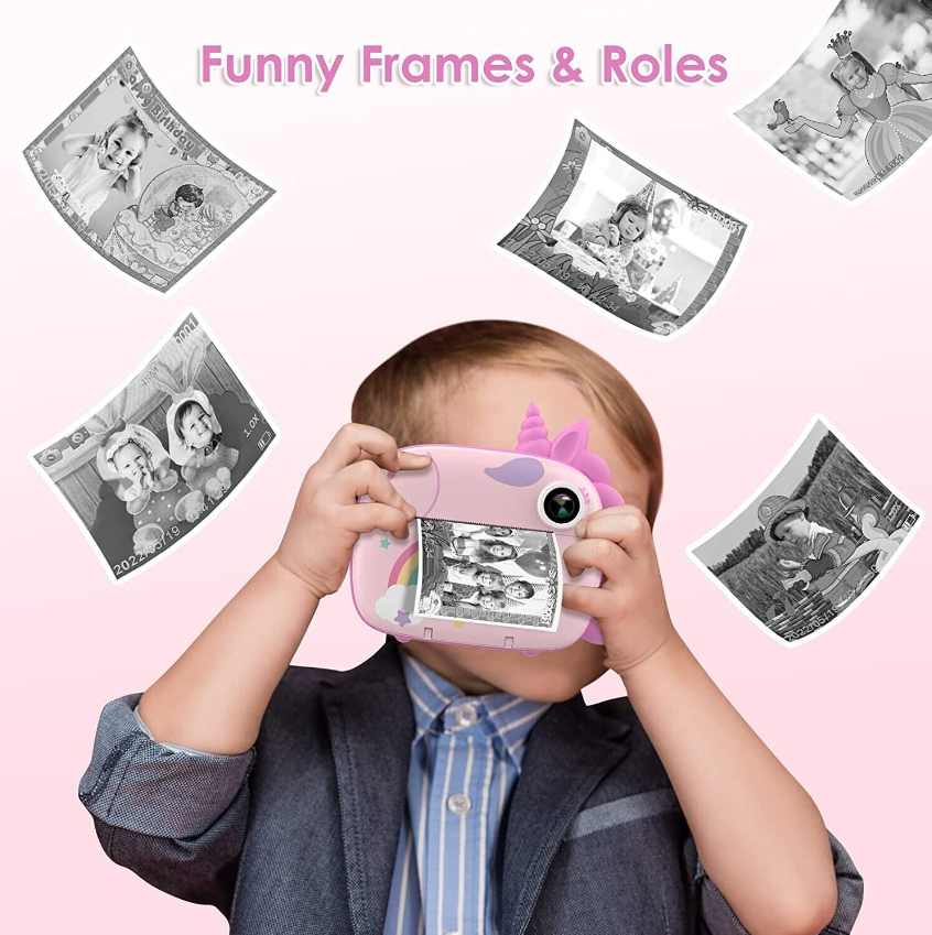 [MULTIFUNCTIONAL & EASY TO OPERATE] This kids camera has 6 functions, such as colour photography, high-definition video, black & white printing, music, playback and games, which allows your kids to operate easily and have fun. Moreover, In order to help your child better record every meaningful moment of their childhood, the camera also has built-in 6 kinds of colour filters, 20 kinds of cartoon photo frames & characters, etc., and supports continuous shooting, timer shooting and other functions.