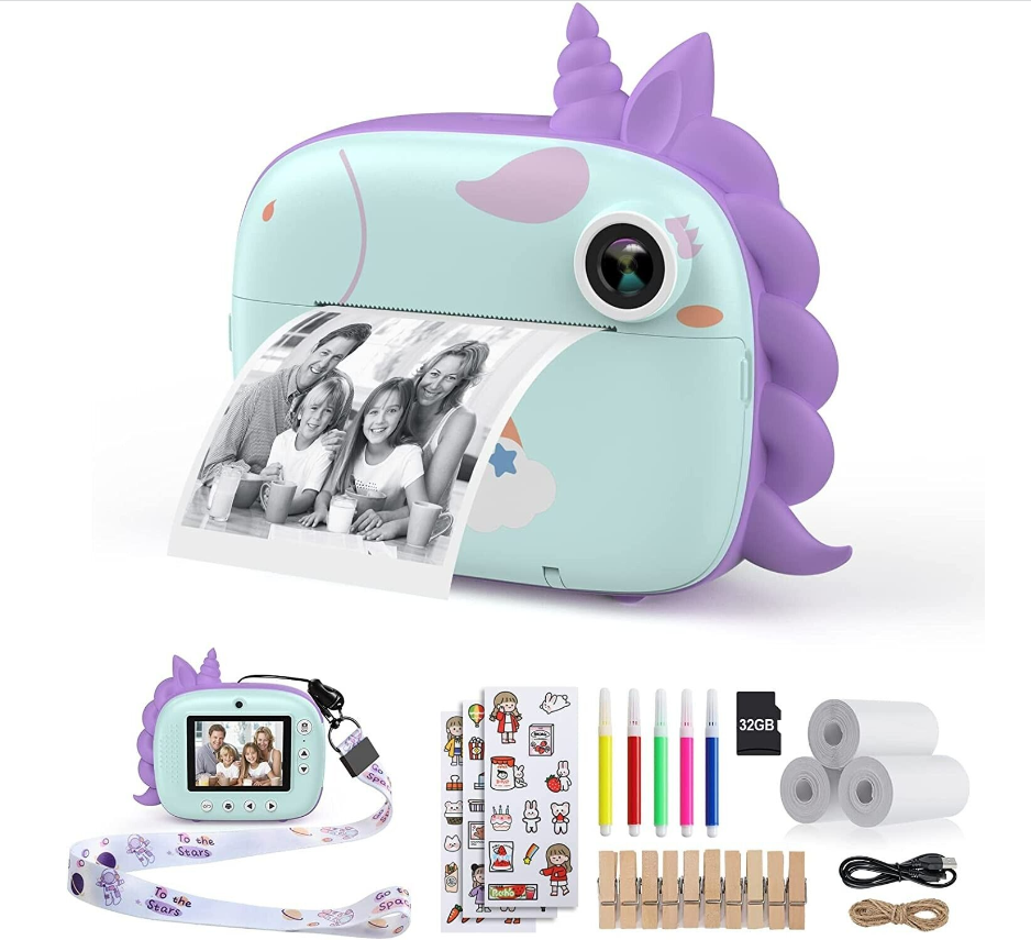 [ZERO INK INSTANT PRINT CAMERA FOR KIDS] This kids instant camera adopts advanced zero ink technology to print without toner. Kids can instantly freeze and print images on 2.16*3.15inch (5.5*8cm) skin-friendly paper in seconds with a simple press. (3 Rolls Print Paper for up to 150 photos are included in the package)