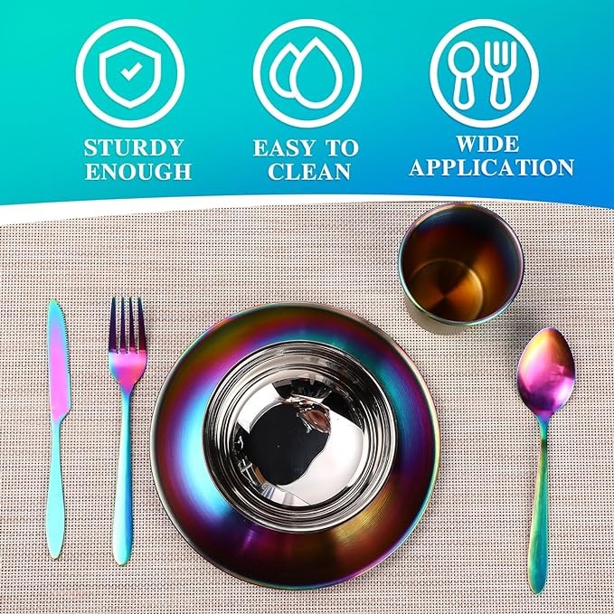 Exquisite Craftsmanship: this rainbow tableware set with colorful shinning look, quality titanium rainbow coating, it enhances surface hardness to reveal both artistic and safety, mirror polished finishing, smooth surface and edges, extremely serviceable and easy to maintain, don't worry the color fading or peel off