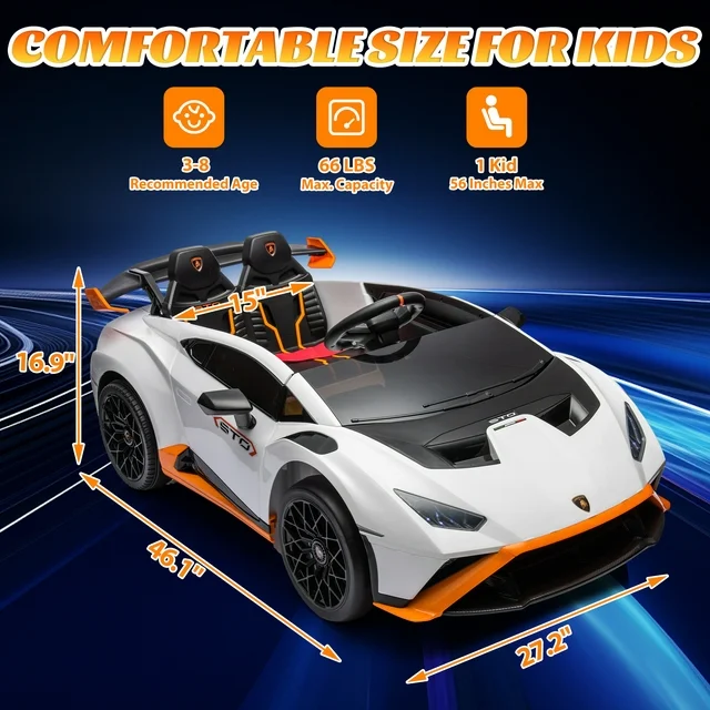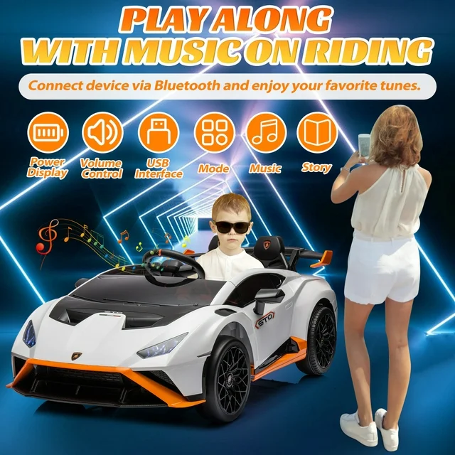 • LUXURY REALISTIC DESIGN -- Officially licensed Lamborghini ride on car features a sleek, streamlined design inspired by the Lamborghini roadster. Bright LED lights enhance the visual effect, cool drift makes riding the ride on car an exciting experience, and the horn and realistic engine sound allow children to experience the feeling of driving a real car. USB port, Music and Bluetooth function add a musical element to playtime. Take control with the remote and execute epic in-place spins and drifts for a more fun kids' driving experience.