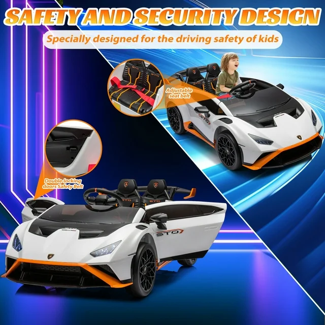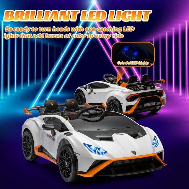 iRerts White 24V Kids Ride On Cars with Remote Control, Lamborghini Huracan Sto Powered Ride on Trucks for Boys Girls Gifts, Ride on Toys with Bluetooth, USB Ports, Music, LED Lights, 360° Spin, Drift