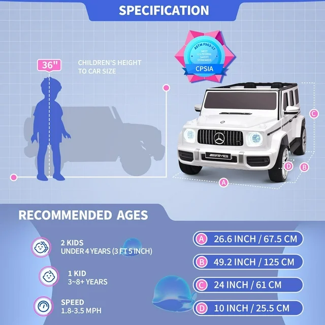SPECIFICATIONS: Overall size: 49.2* 26.6* 24 INCH (L x W x H). Maximum Load: 130 LBS (59KG). Battery: 7AH. Speed Range: 1.8-3.5 MPH (3-5.5 KM/H). Recommended ages: 3-8 years.