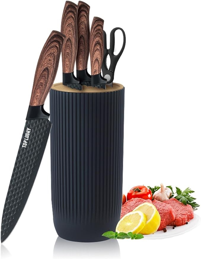 • 【Practical and Beautiful 6-Piece Set】This 6-piece knife set with knife block includes: 12" Kitchen Knife, 12.6" Chef's Knife, 12.8" Japanese Knife, 9.3" Utility Knife, 7.9" Kitchen Scissors, 9.3" Universal Knife Block. It can help you easily cut meat, fish, vegetables, fruits, etc. The practical and beautiful kitchen essential knives give you a good cooking experience.