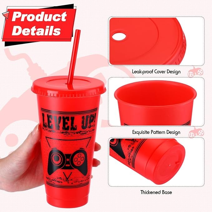Video Game Elements: these plastic iced coffee cups are designed with various gaming elements, such as game controllers and texts, which can add focus to your gamer themed events, ideal for boys and gaming lovers birthday parties