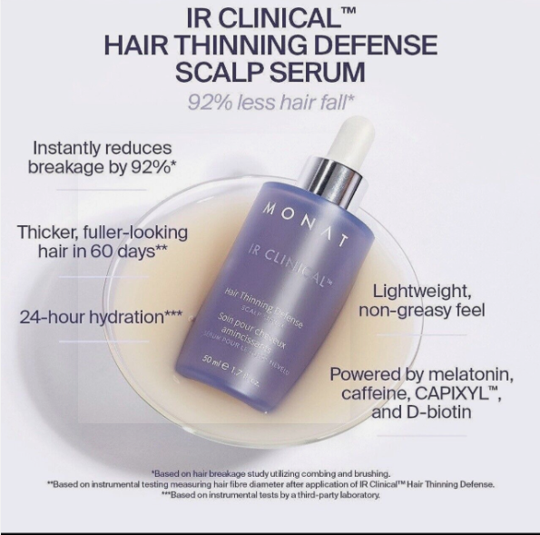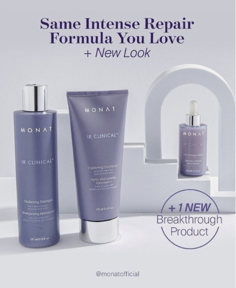 Monat IR Clinical Set Shampoo Conditioner and Serum NEW For Thinning Hair. IR Clinical System/ Brand New in box Densifying Fine to Medium Hair Types All Hair Textures The breakthrough is here! The new IR CLINICAL™ System is a complete regimen that features CAPIXYL™ and a unique blend of ingredients that helps to strengthen and thicken hair while also preventing damage from brushing and combing. Developed in collaboration with a world-renowned expert in hair and scalp science, this lightweight, non-greasy serum is proven to help boost hair growth, immediately reduce breakage, and has shown noticeable results of thicker, fuller-looking hair.o |