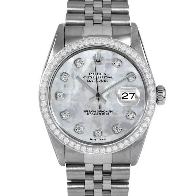 Pre-Owned Rolex 16014 Men's 36mm Datejust Watch, Custom White Mother of Pearl Diamond Dial & Custom 1ct Diamond Bezel on Rolex Stainless Steel Jubilee Band