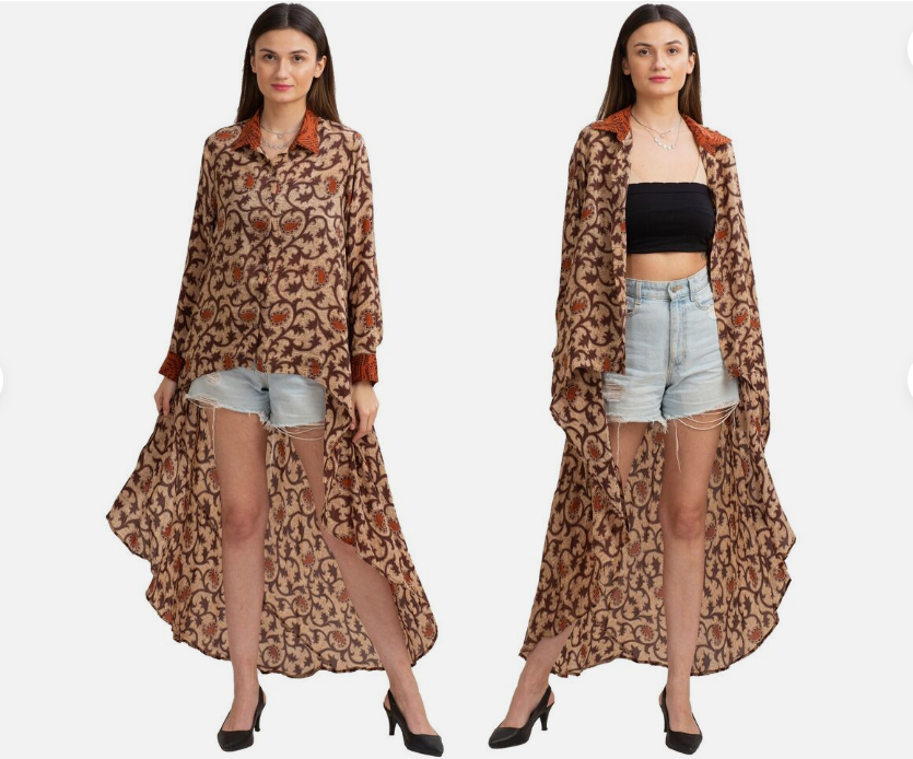 4: Request your own custom piece. We can make this exact design in a fabric/saree of your choice. Same price if you select the same saree fabric - price will vary if you select a different fabric. Contact us for more info.