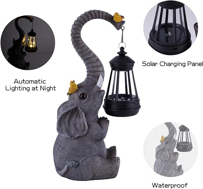 Excellent Material: This elephant sculpture solar light is made of high-quality resin, environmentally friendly and waterproof. Equipped with a solar charging panel, it converts solar energy into electrical energy during the day and stores it in rechargeable batteries without worrying about charging issues.